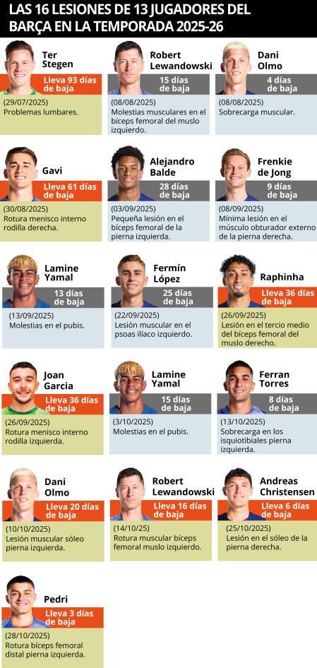 目前,巴萨仍有8人处于伤缺状态,不过莱万多夫斯基和奥尔莫将在本周末对阵埃尔切的比赛中复出。这一问题令俱乐部内部深感担忧并高度重视,原因是本赛季的13次伤病已达到上一整个赛季(26次)的一半。